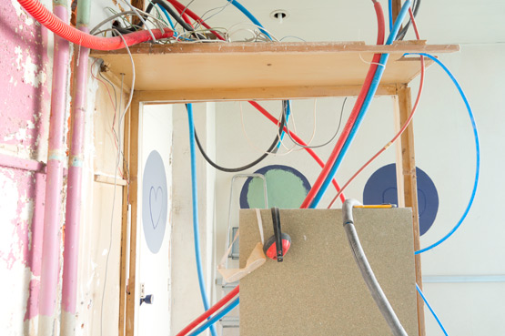 This is the plan: a double sink, a double walk-in shower, a smaller toilet and enough space for toiletries and towels, the washing machine & dryer. It currently looks a bit like our own Beaubourg (Centre Pompidou) with the red & blue plumbing:
