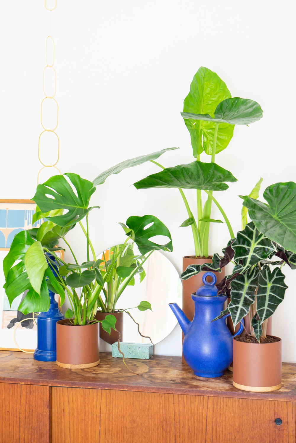 This is what the VIJ5 Plant Collectors look like in our new guestroom. They give the tall Alocasia some extra height, which is something I always look for when styling a “plantgang”. A few tall plants give the group some height, then you add different textures, interesting pots and work with a nice color palette. Now that I look at it, I could even connect the lower pots to the tall pots and create two super high plant pots for the Alocasia Macrorrhiza!